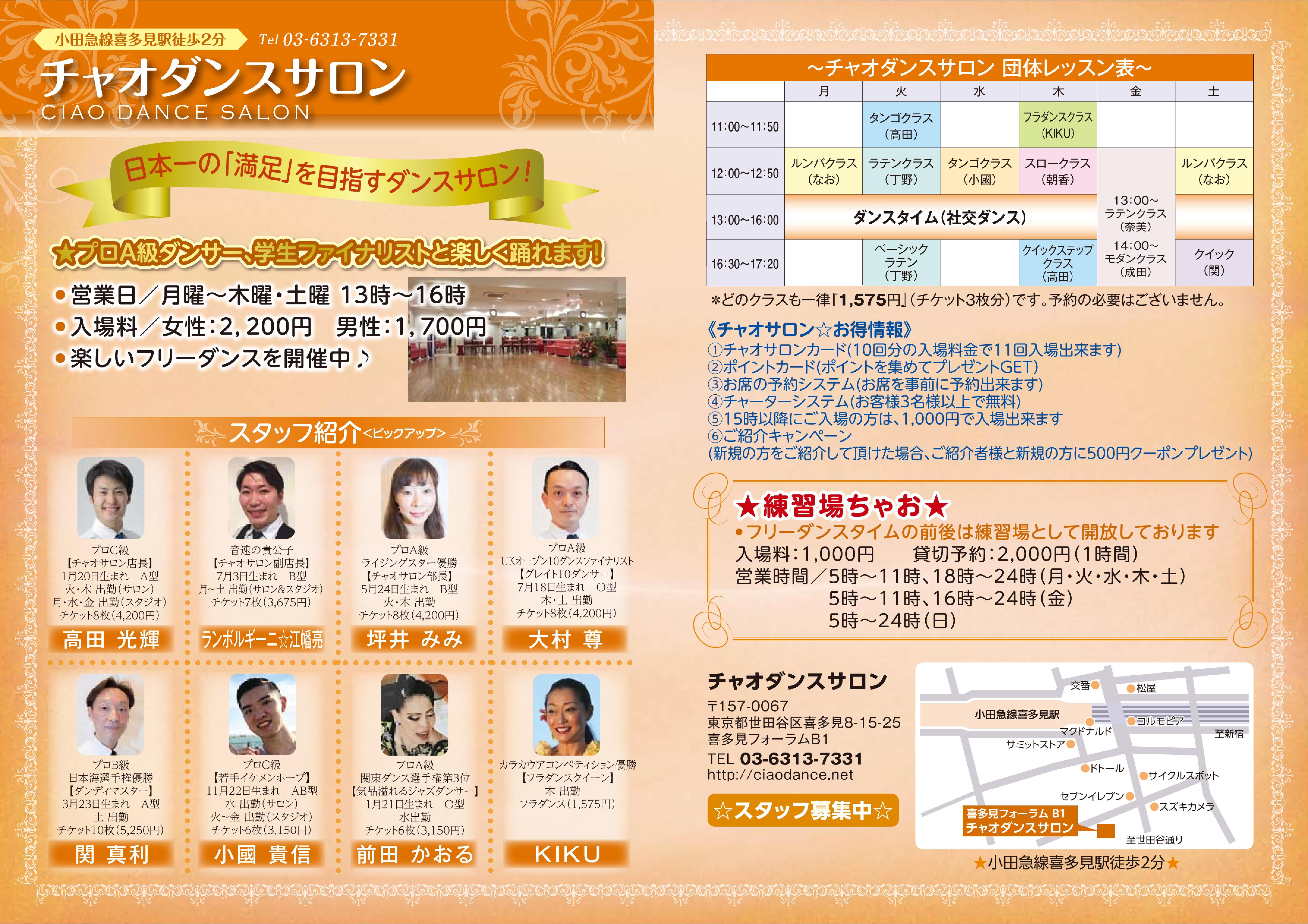チャオ ダンス サロン. 平日営業時間:13:00 ~ 15:00 定休日:金、日. ・予約の必要はございません チャオダンスサロン(喜多見) 03-6313-7331 チャオダンススタジオ(成城) 03-6411-8637 チャオダンスサロン(喜多見) 団体レッスン. 平日営業時間:13:00 ~ 15:00 定休日:金、日.